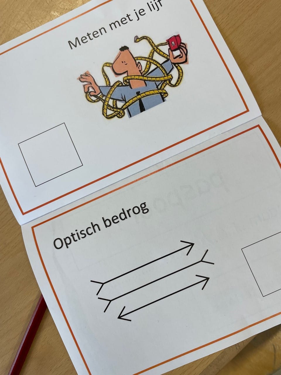 Ook de groepen 3 en 4 gingen aan de slag met een meetpaspoort. Zij gebruikten lichaamsdelen als meetinstrumenten van het eigen lijf., deden oefeningen om hun kracht te meten en gingen aan de slag met optisch bedrog. Alles opbrengsten van de metingen werden geregistreerd In het paspoort .