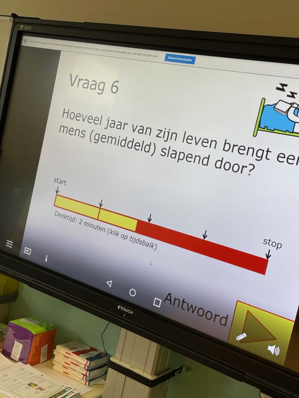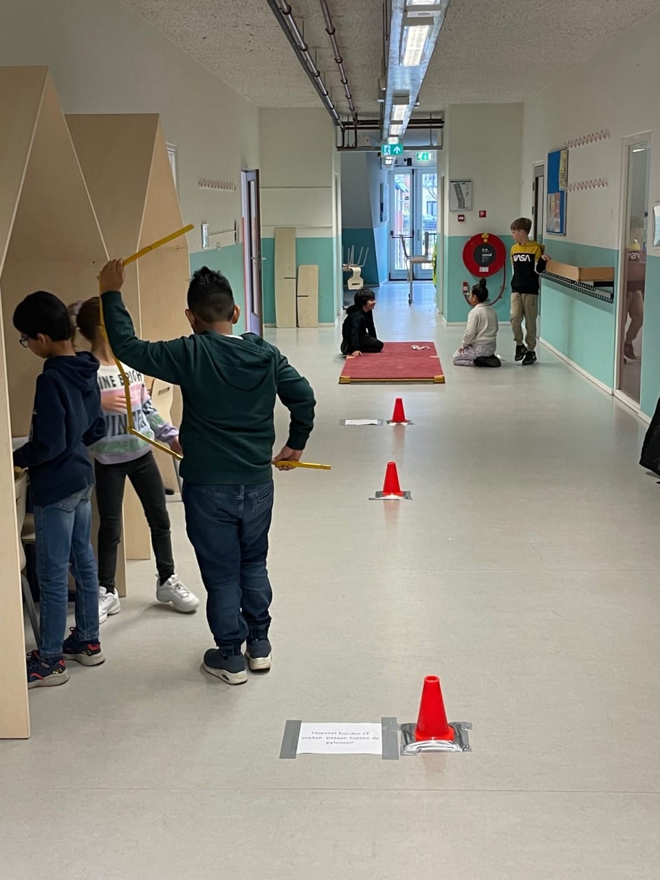 Groep 5/6 deed een weetjesquiz die leerlingen prikkelt meetreferenties in te zetten en verder te ontwikkelen. Ze deden allerlei meetopdrachten met hun lichaam en gingen ze reken met hun lichaam’, zo moesten ze het aan tal botten in hun hand aftrekken van het aantal botten in hun hele lichaam. Ook deden ze oefeningen met kracht en geluid.