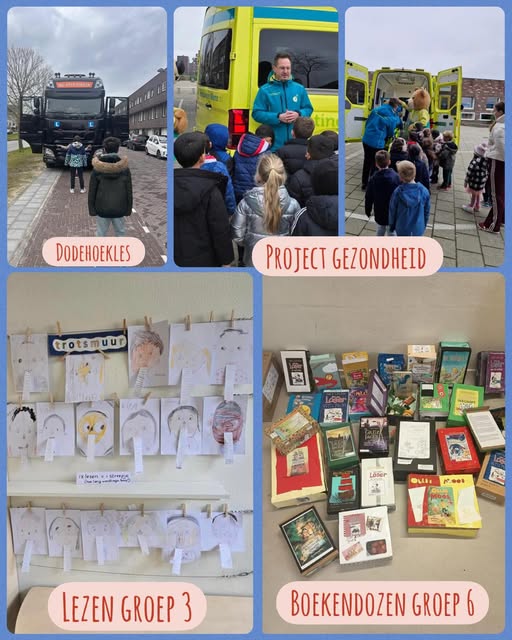 Afgelopen periode is er weer zoveel geleerd op Waterland! De groepen 1, 2 en 3 sloten het project gezondheid af met het bezoek van een echte wensambulance. In groep 7 leerden de leerlingen wat een dode hoek is en hoe je hiermee om moet gaan. In groep 6 werden prachtige boekendozen gemaakt. In groep 3 steken alle leerlingen hun tong uit bij het zelfportret om te laten zien hoeveel ze al gelezen hebben!