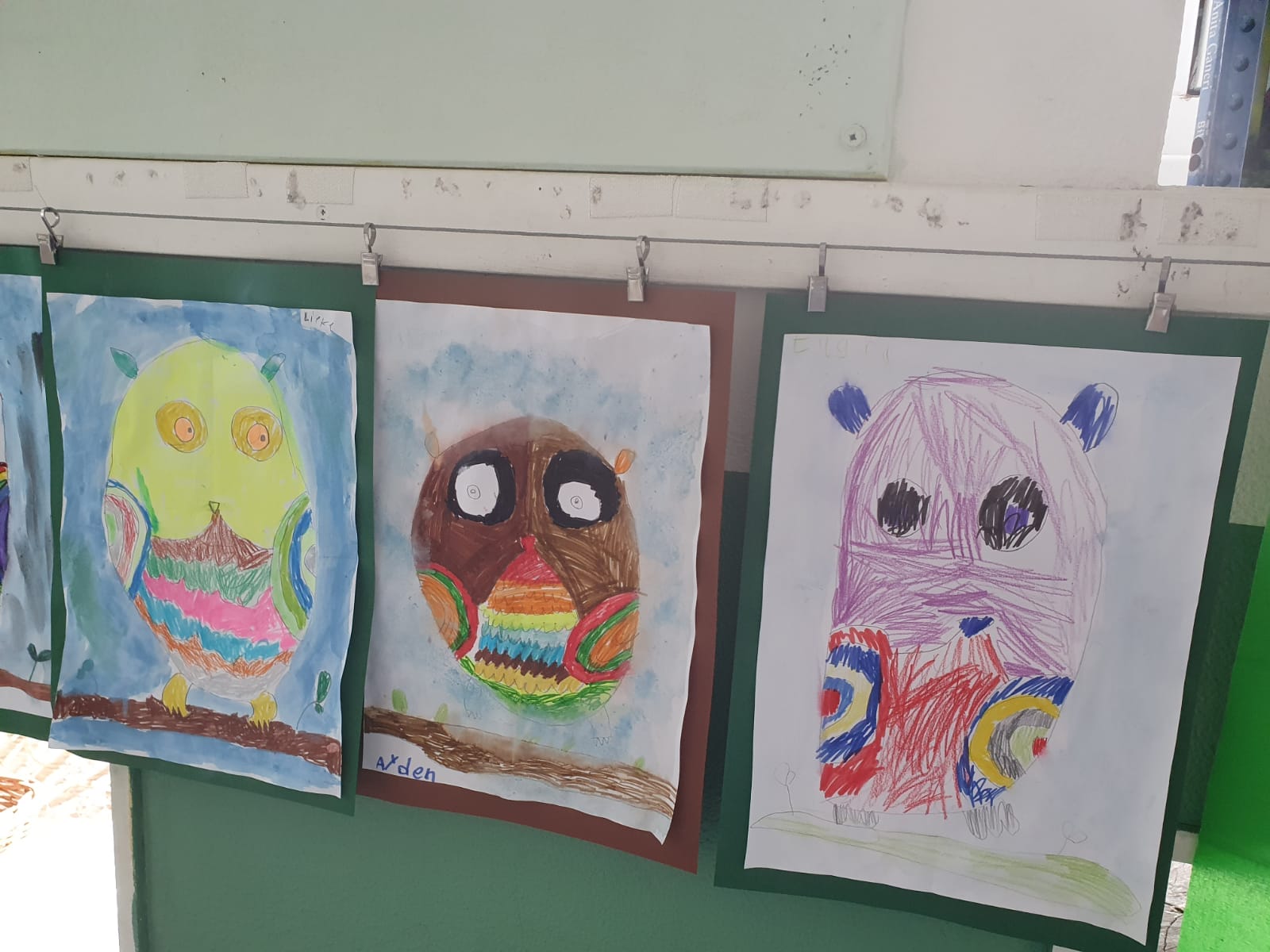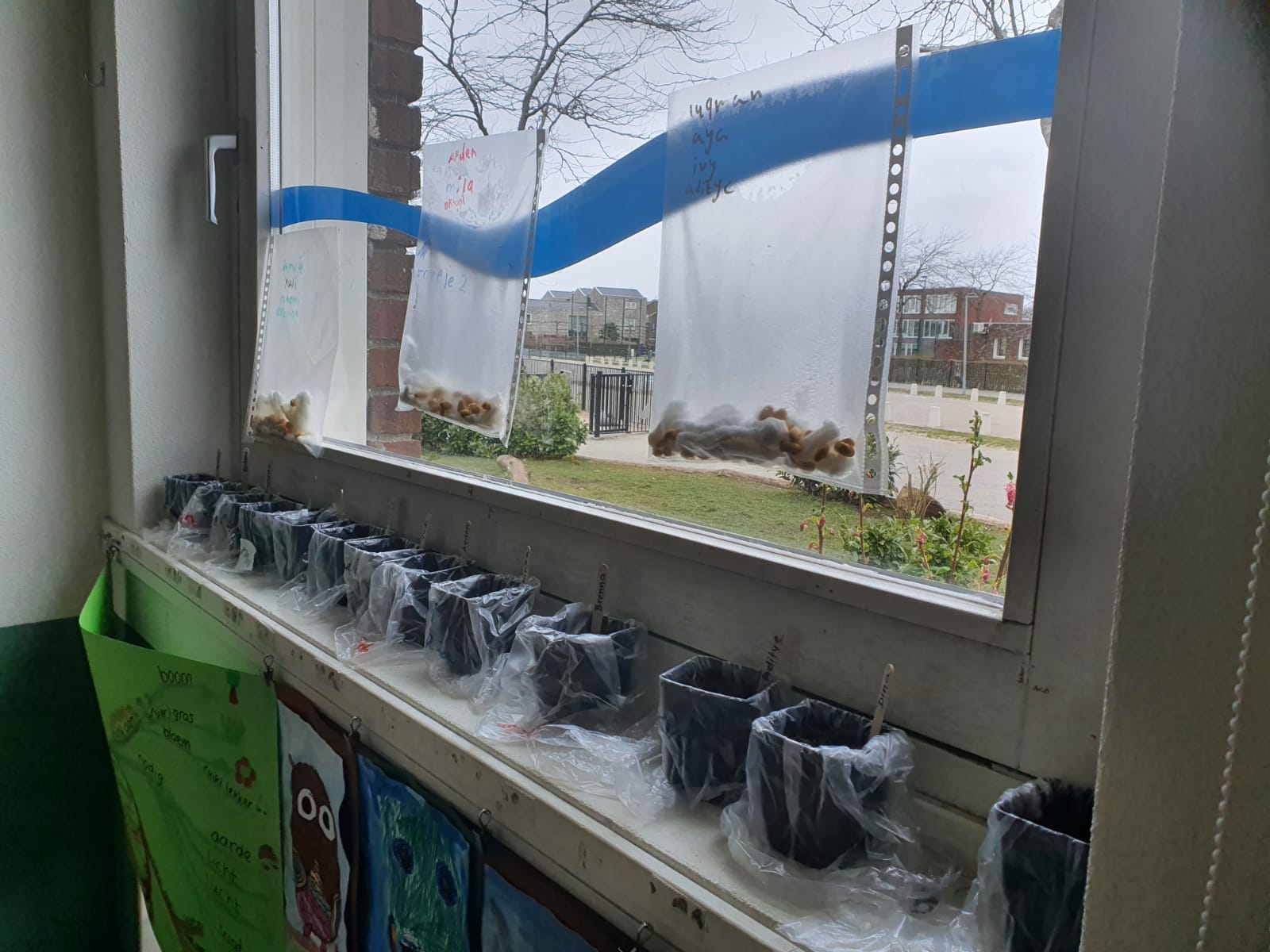 Er hangen bonen in zakken, we onderzoeken wat er gebeurt en hoe snel het groeit. De boom met de mooie vogels staat te pronken in de hoek.